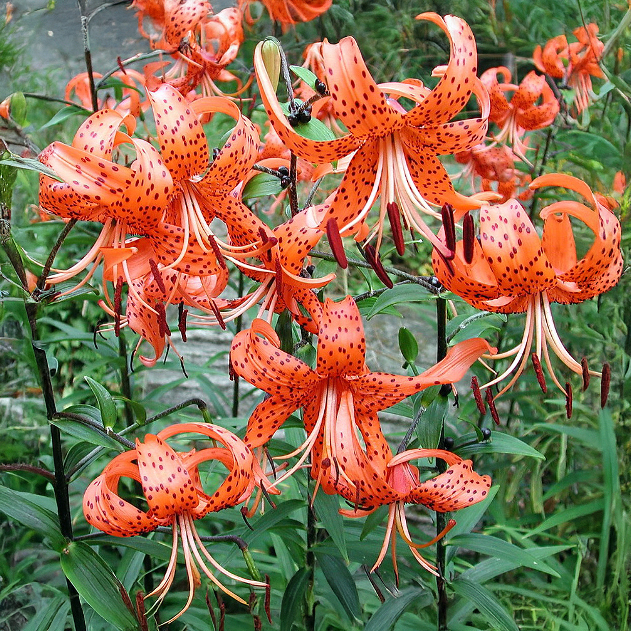 El Lilium ‘Lancifolium’ es una variedad clásica y muy decorativa, reconocida por sus flores llamativas con pétalos arqueados hacia atrás y colores vivos que van del naranja al rojo, a menudo salpicadas de puntos oscuros. Sus tallos firmes alcanzan entre 80 y 120 cm de altura, lo que la hace ideal para borduras, macizos y arreglos florales de gran impacto visual.